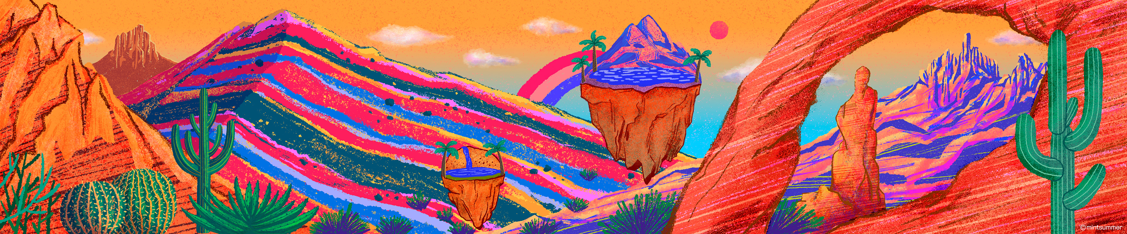 The first sketch depicted the desert I met in my dream. He dreamtly depicted the rainbow-colored mountains, rocks, and an oasis that felt like a utopia inspired by 'Vinikunka' and added dynamism by arranging animals. However, the client wanted a mysterious but desolate desert appearance, so the animals were excluded from the final result.